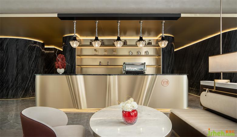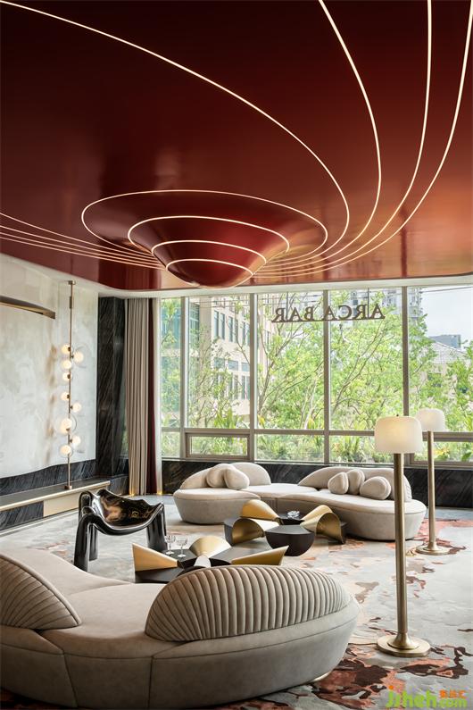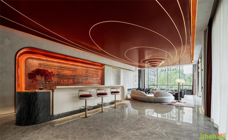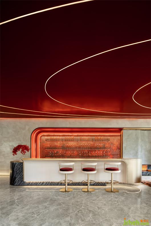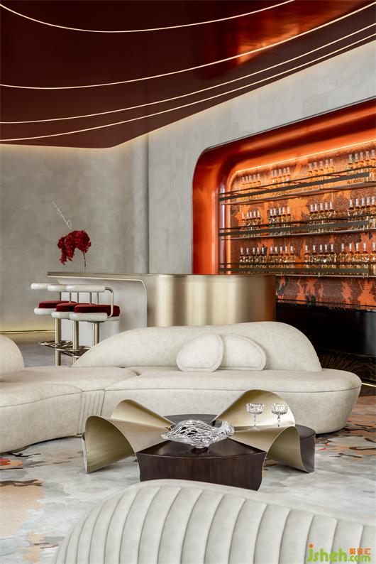 橙色透過暖黃燈帶聚焦空間的高光色,落在水吧區(qū)。熱情洋溢的情緒色彩噴薄而出,顯示奢貴的都市氣息。沙發(fā)椅勾勒對話的美好弧度,構(gòu)筑出更為皎潔的對話場景。
