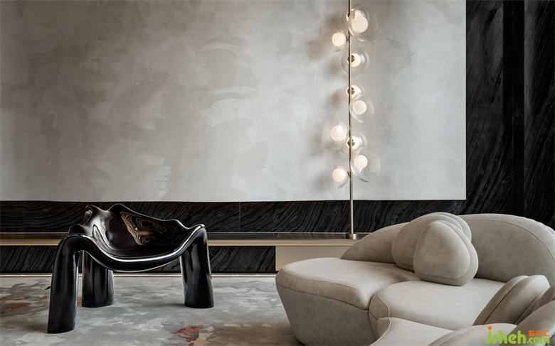 為充分挖掘場域特征,設(shè)計(jì)師以橙紅作為高光色彩,與此同時(shí),加入黑色、米色營造更富有平和感的現(xiàn)代空間。沙發(fā)椅呈現(xiàn)出自然形態(tài),如同歷經(jīng)海水沖刷的石塊,擁有貝殼般的豐富紋理。