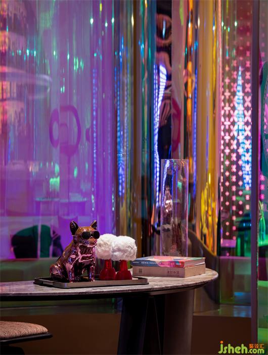 綠色的光像來自森林深處,神秘而富有生機。紫色光帶來一種幻覺體驗,小酌后,心緒跟著空間溫度俱升,熱情而熱烈。