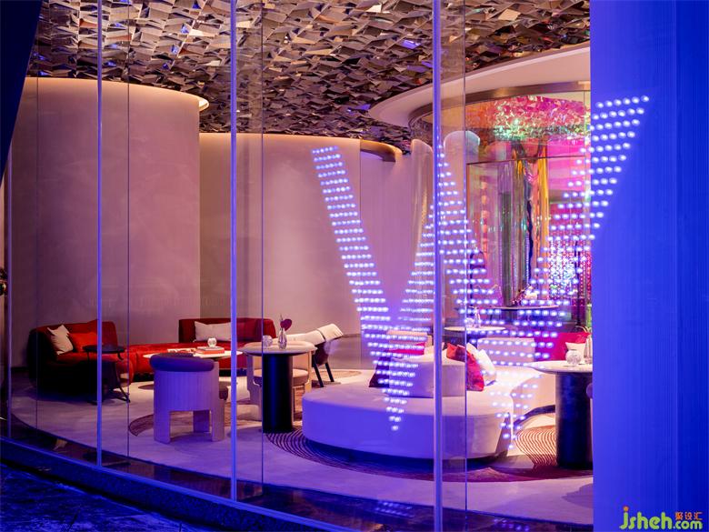 望向室外,徘徊在都市夜空中的字幕耀眼奪目,閃動如鉆石一般的紋理與光澤,聚焦著城市的高光。為觀者營造時光倒置的驚喜感受,制造獨特的空間體驗,呈現(xiàn)出令人心生向往的都市幻境。