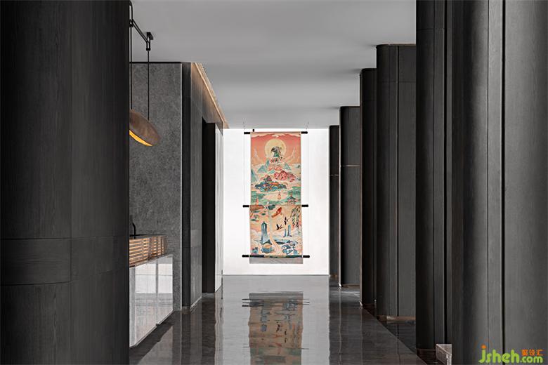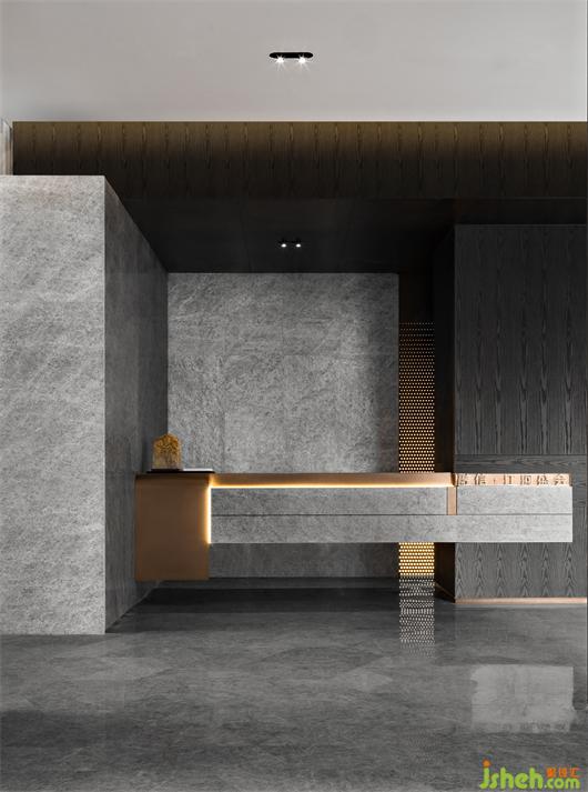 黑金色調(diào)相諧,冷灰色大理石地磚,維幾設計黛色原木墻面與金色鏤空相映,空間的低調(diào)奢華漸露。擺件意向取自壽山石雕刻印章,將歷史文脈融入現(xiàn)代空間。