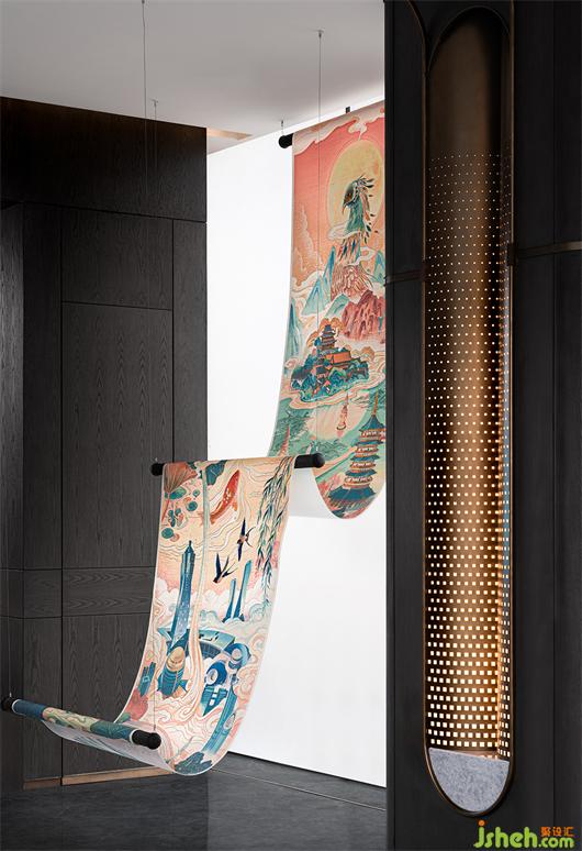 織錦以懸空形式呈現(xiàn),維幾設計在藝術(shù)之上進行二次創(chuàng)作。本是靜態(tài),此刻卻如畫龍點睛般呈現(xiàn)靈魂生命。