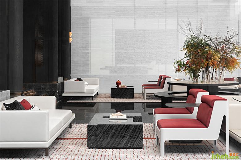 大理石與金屬質(zhì)感的組合,搭配深暗紅色絲絨面料的點(diǎn)綴,傳統(tǒng)屬性與精致細(xì)膩的元素相碰撞,是對古典色彩、現(xiàn)代材質(zhì)的再探索。