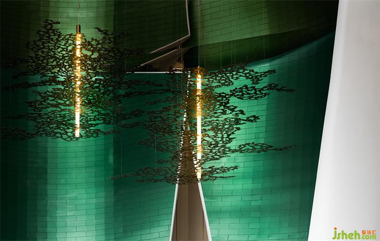 綠意與金屬光澤相映,藝術(shù)裝置取自自然的光斑形態(tài),破土而出的"綠葉"半包擁裹,金色的燈線從“樹影”穿插懸落,猶如雨林秘境。皮革與金屬,自然屬性與精致細(xì)膩的元素碰撞融合。