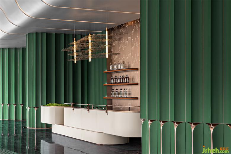 吧臺(tái)背景板上是發(fā)光的亞克力材質(zhì),擬態(tài)自然雨滴墜落,白色皮革包裹吧臺(tái)全周,武漢售樓處設(shè)計(jì)以苔蘚點(diǎn)綴,質(zhì)感金屬線條縱橫,著重突出空間的穩(wěn)持、高奢的氛圍。