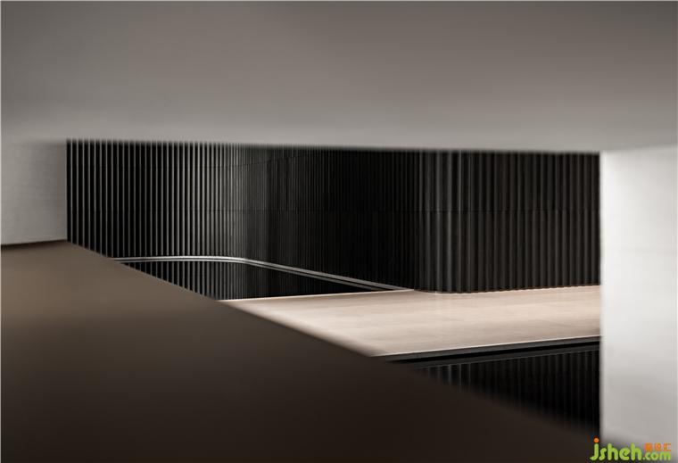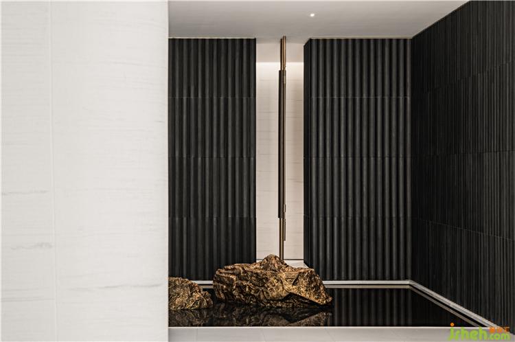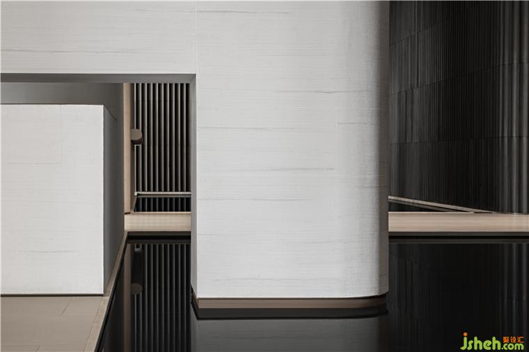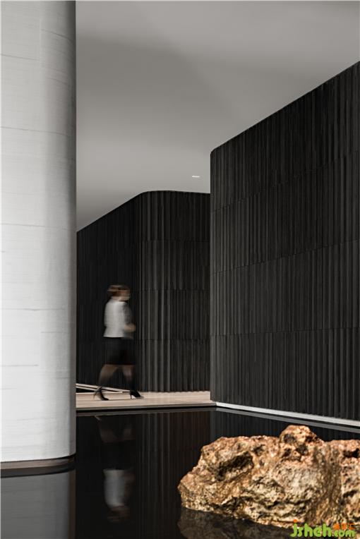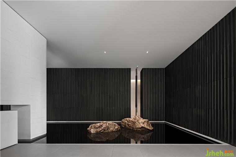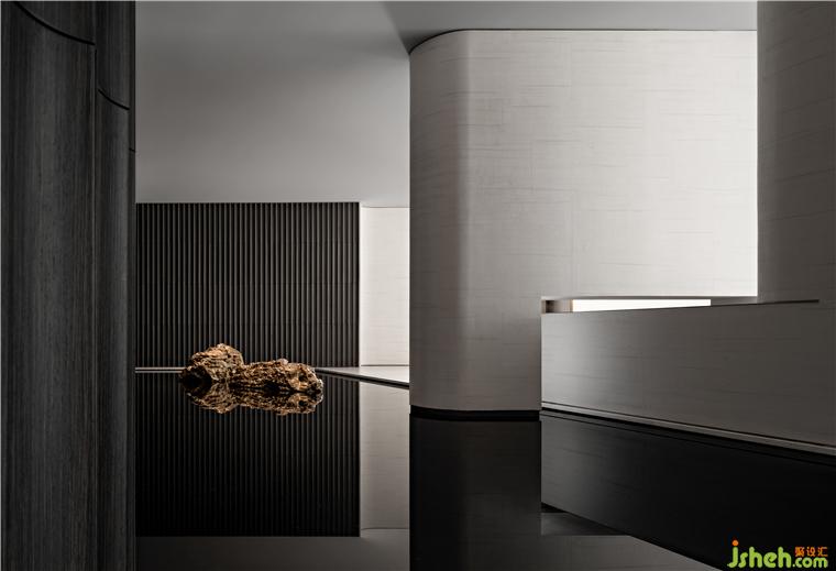光成就變幻莫測的水面反射,山石映照粼嶼。營銷中心設(shè)計(jì)紋肌理搭配黑金墻面,微微陰翳在光與暗中浮動(dòng)。