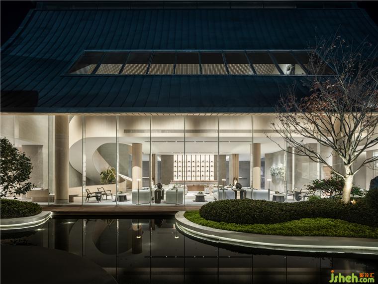 與君初識(shí),會(huì)客有道,小聚茶香滿(mǎn)室。茶室以茅屋草舍、堂空響旗為設(shè)計(jì)元素,層疊的木作線(xiàn)條堆砌一面長(zhǎng)方壺墻。