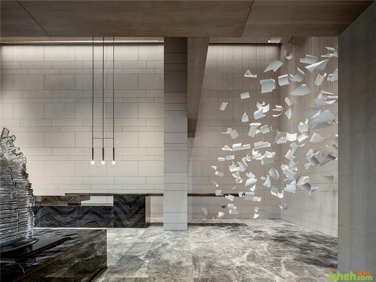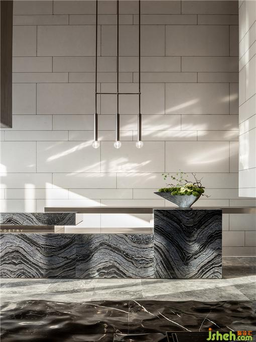 整體空間使用純粹細(xì)膩的沙白色大理石,抽象花紋的大理石地面,銷售中心設(shè)計(jì)配合線型燈具設(shè)計(jì)打造簡約的空間意境。