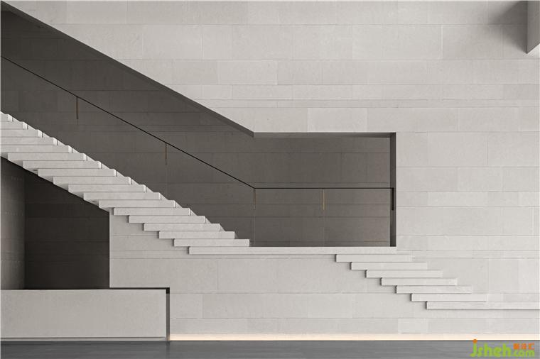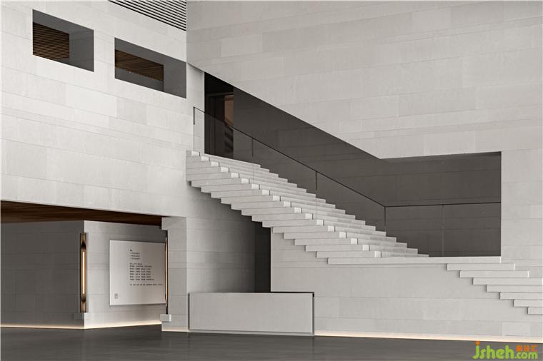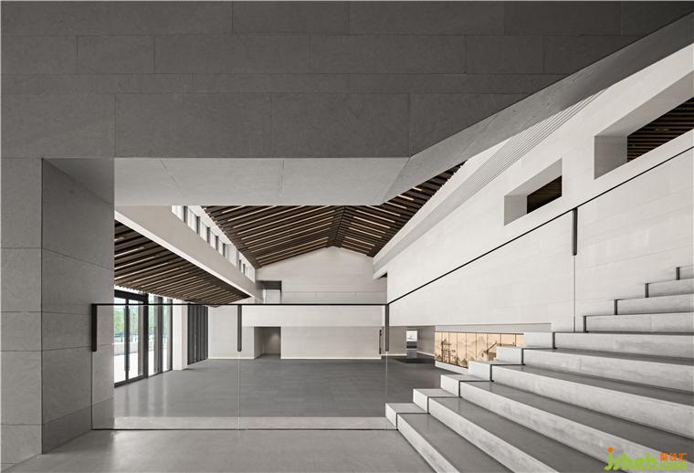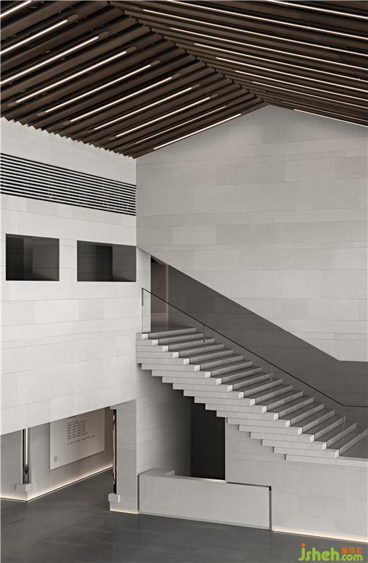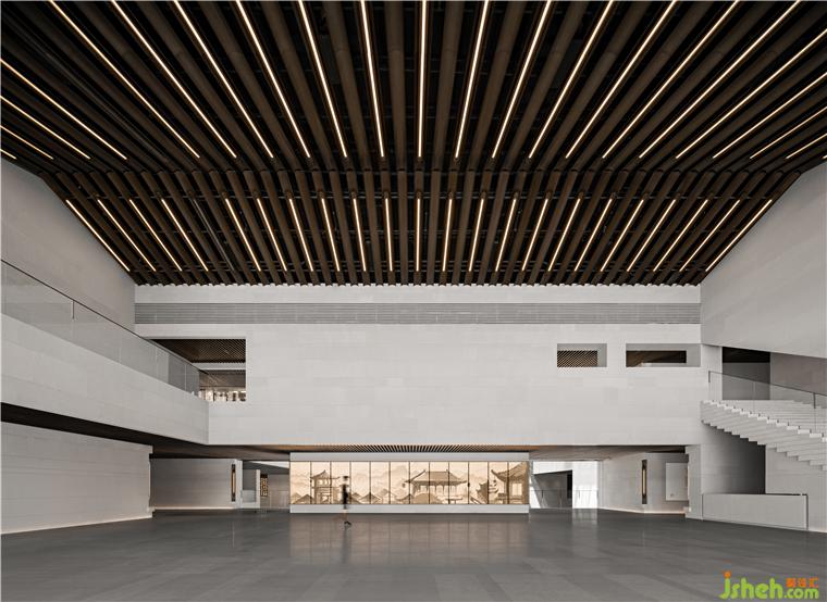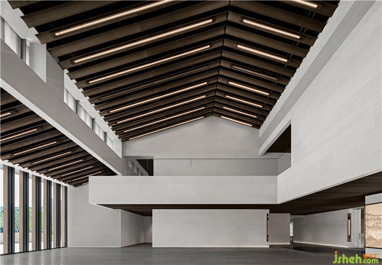 南接待大廳挑空空間,垂拔出宏大莊嚴(yán)的歷史氣息,如瓦片排列的屋脊,在對(duì)稱中加入不對(duì)稱,水平與塊面的切割,重新塑造體塊關(guān)系。