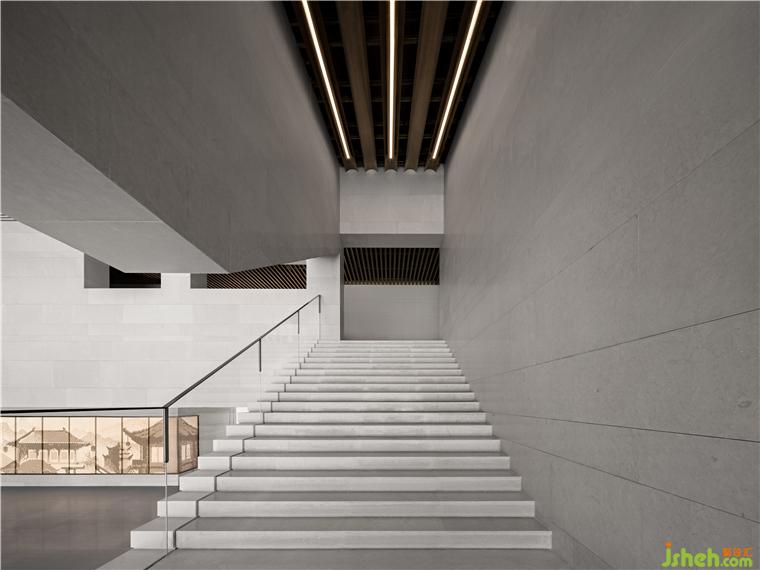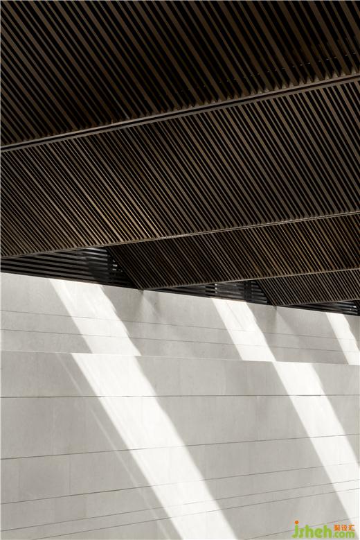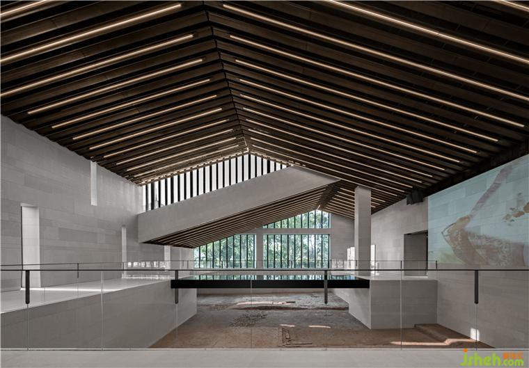 玻璃頂面如同一個天井,陽光潑灑下來被格柵切割,遺址展示館設(shè)計光影灑落如同天然的晷針,無聲地記錄日升日落,滄海桑田。