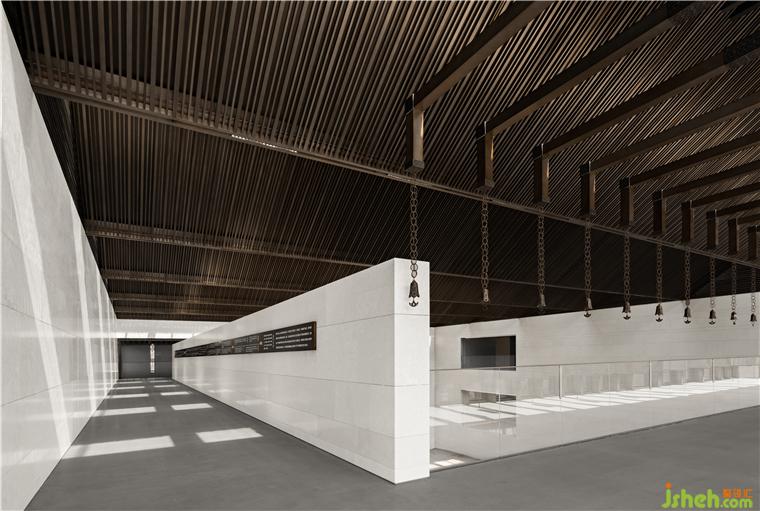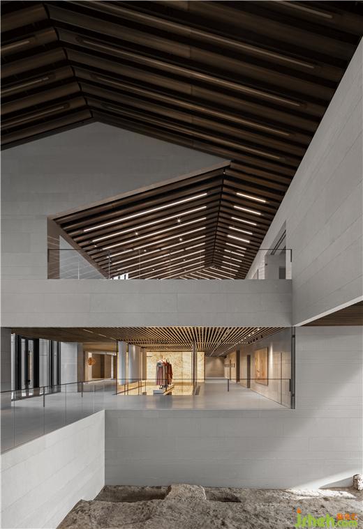 半懸空脫開工藝打造簡易的“望樓”,作為室內(nèi)的觀景臺,中國古建筑因木構(gòu)件為主材料的特性,遺址展示館設(shè)計能保存下來的極少,僅有夯土、石礎(chǔ)和磚等構(gòu)件。