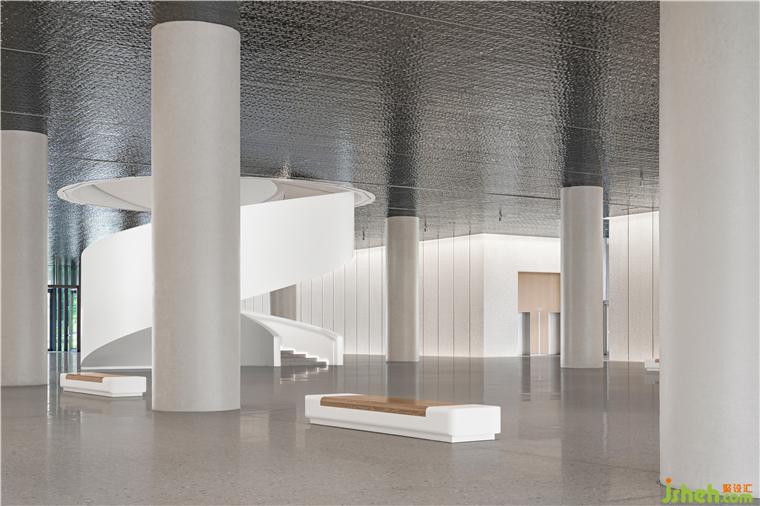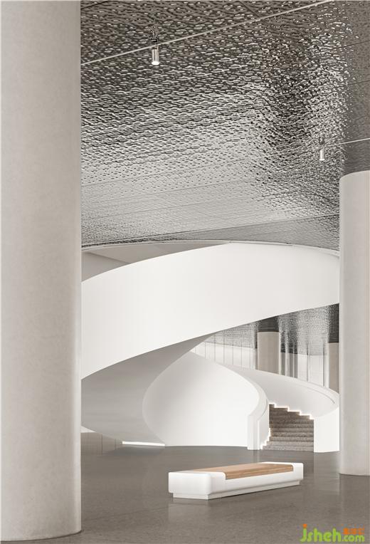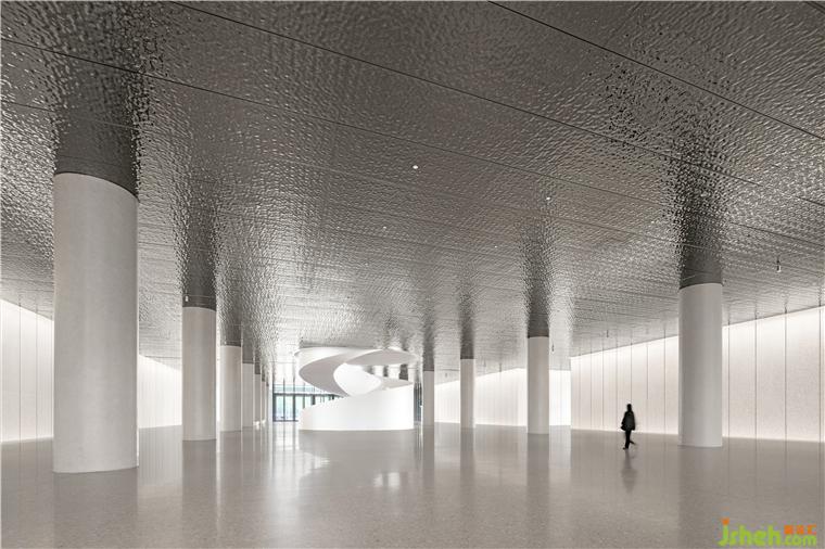 首層室內(nèi)吊頂采用了整體式的漫反射系統(tǒng),公共藝術(shù)中心設(shè)計將自然光線通過反射引入室內(nèi),形成自然與室內(nèi)光環(huán)境的循序過渡。