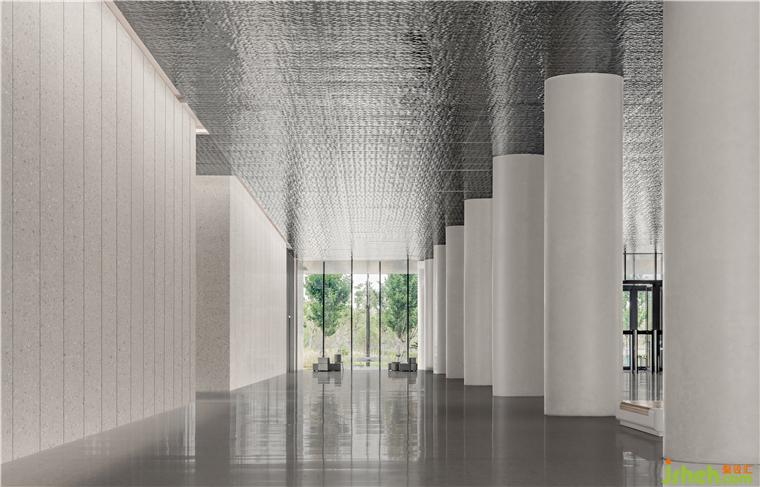 吊頂水紋鏡面不銹鋼,延伸至室外灰空間入口玻璃玄關(guān)內(nèi)推形成緩沖空間、降低建筑能耗并消隱建筑的體量感,形成統(tǒng)一、干凈的界面。