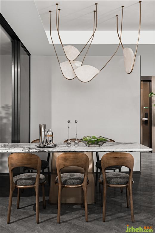 金屬線打撈起貝母質地玉石燈,光潔的餐具映出大理石餐桌交織的紋理,金風玉露的相逢,勝卻世間無數。