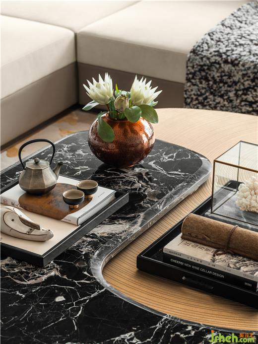 沿著木紋而生的大理石干泡臺蜿蜒出靈動的曲線,流觴曲水的風雅被迎進室內(nèi)。銀壺盛滿至潔的秉性,綠意輕展清麗的姿態(tài),明亮與淡雅,清涼與溫潤,動與靜融合,杭州縵云樣板房設(shè)計營造可觀賞,可把玩,可品嘗的互動空間。
