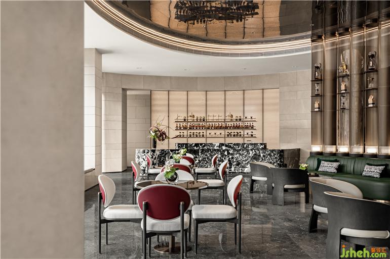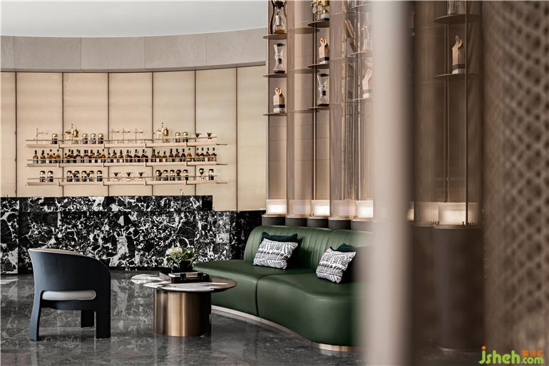 水吧臺基于整體基調,無錫金地華著營銷中心設計沿用前廳的大理石元素,自然氣質與金碧輝煌的酒品陳列交織出低奢的氛圍。于此暢談,輕松恣意。