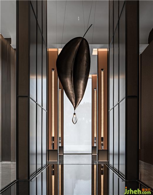 水景上方的藝術(shù)裝置以金屬葉片形態(tài)懸掛吊頂,“雨滴”從葉片滑落,潤養(yǎng)大地生出綠植小景,寓意水生萬物,生生不息。