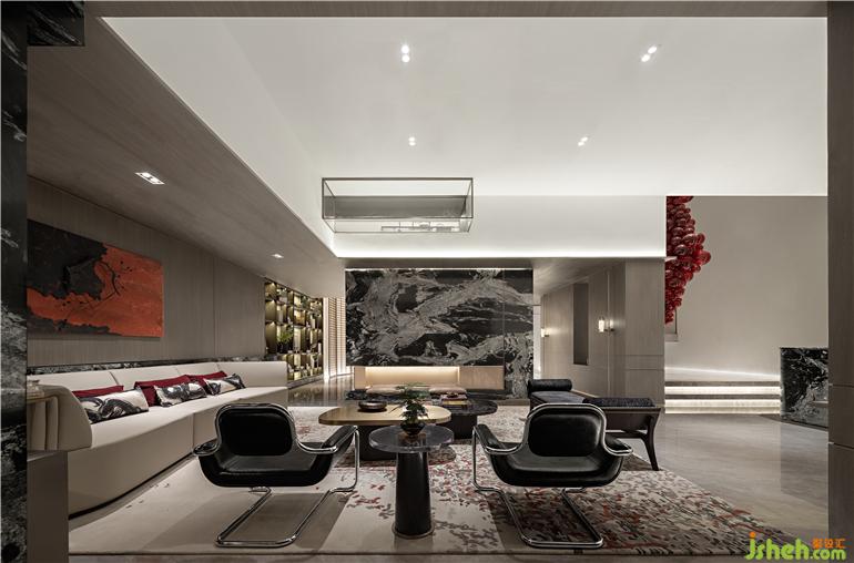 用感性認知去沉浸式體驗空間的理性氛圍,武漢綠城湖畔雲(yún)廬樣板房設計以橙紅作為情緒的高光色彩,加入黑色、灰色營造更為平和感的現(xiàn)代空間,得到更為直觀的視覺恒動力。
