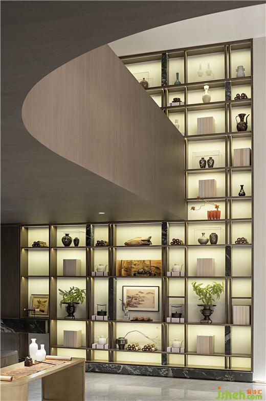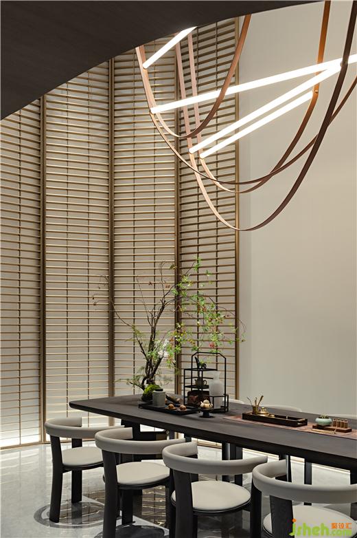 茶室從宋代夏圭的山水畫《溪山清遠圖》中汲取靈感,將西方建筑語匯融入東方畫境,藝術(shù)形態(tài)的吊燈有如泉水般,光線傾瀉而下,配以長條案桌,渾厚利落,猶如金石篆刻,清澈、挺拔的生機貫穿結(jié)構(gòu)與線條中。