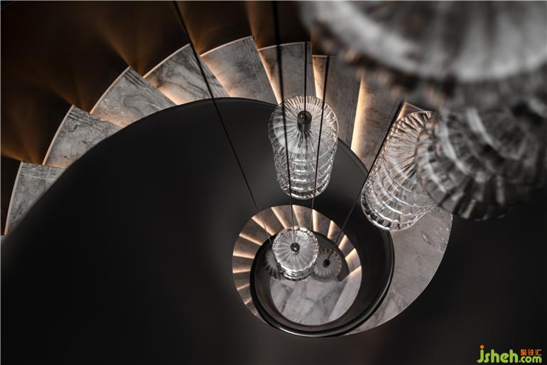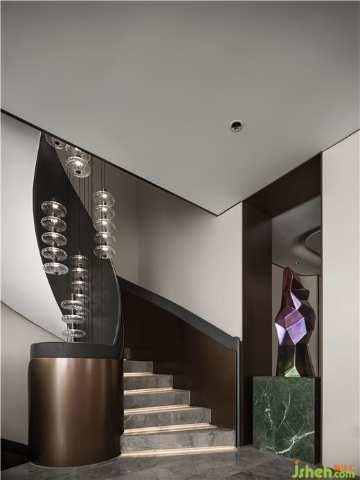無錫融創(chuàng)CHINA山水江南樣板房設(shè)計(jì)利用不同材質(zhì)特性營(yíng)造視覺沖突,以多元的變化視角,在空間中著色流光。旋轉(zhuǎn)樓梯擁抱成鸚鵡螺的形態(tài),白色大理石映襯珍珠般的光澤,水晶燈整齊排列,如深海中懸浮的水母,自由的符號(hào)隱晦地在場(chǎng)所中告白。