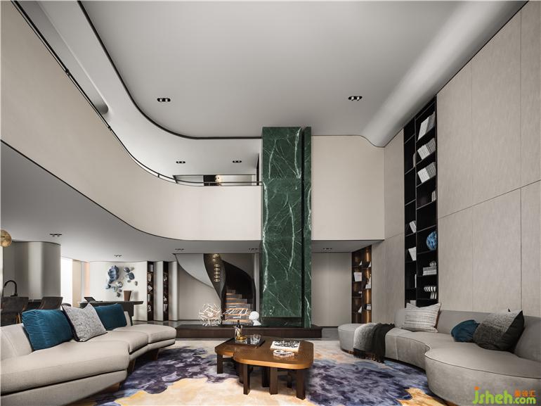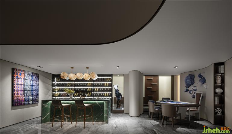 曲線裝飾墻鑲嵌湖石裝置,在光影的作用下,仿佛透過清澈的湖水探到湖底,體塊與色彩的互動(dòng),室內(nèi)與室外彼此映照,無錫融創(chuàng)CHINA山水江南樣板房設(shè)計(jì)探索著社交空間的新造型。