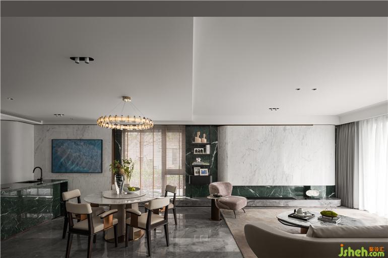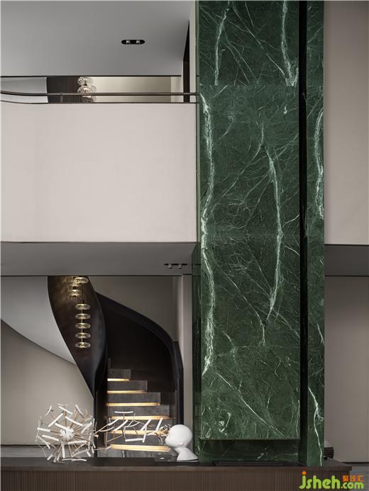 無錫融創(chuàng)CHINA山水江南樣板房設(shè)計(jì)拆除地下原建筑窗與隔墻,提升空間利用率的同時(shí)打造室內(nèi)庭院景觀,玉紋綠大理石看似隨意點(diǎn)綴各處,如一灣又一灣的太湖綠波串聯(lián)起整個(gè)空間,實(shí)現(xiàn)隔而不斷的過渡層次。