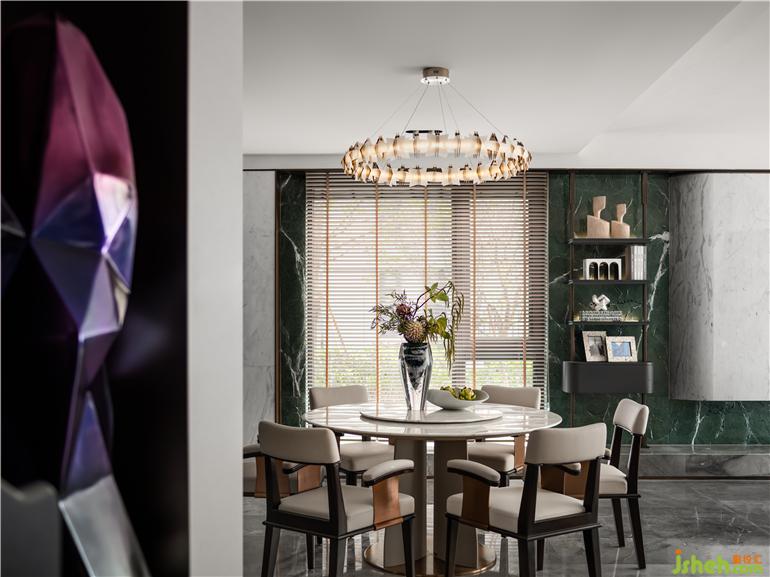 圍坐是中國(guó)文化團(tuán)圓和氣親密無間的表象,花藝迎接陽(yáng)光,與自然風(fēng)光交織出靜謐恣意的氛圍,天花上游魚吊燈點(diǎn)亮串聯(lián)空間的”太湖碧波“,如果空間是一首詩(shī),也要是主題鮮明的那一首。