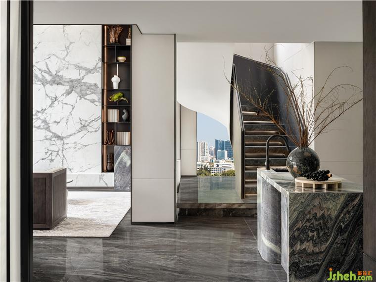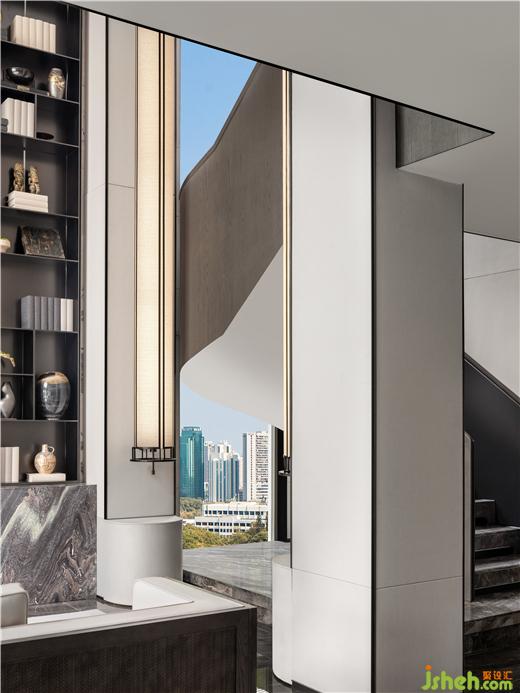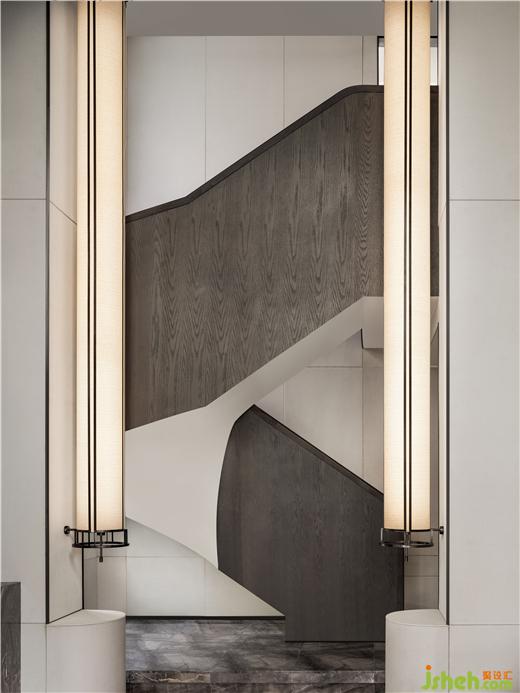蜿蜒樓梯自下而上延伸,旋轉(zhuǎn)如水紋波瀾,以文人之雅,禮迎主正。