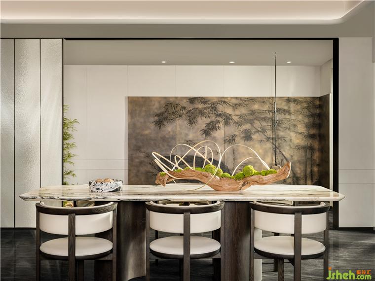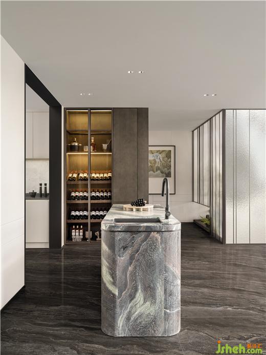 島臺如海水江崖,遠(yuǎn)觀似山,近觀似水。抽取蜀錦的元素,對傳統(tǒng)紋樣元素的延展,龍湖恒邦·花千樾別墅設(shè)計(jì)將海岸灘涂的紋理與粗粒顆粒質(zhì)感結(jié)合。線面精致分隔餐廚區(qū)域,營造韻律感空間褶皺。