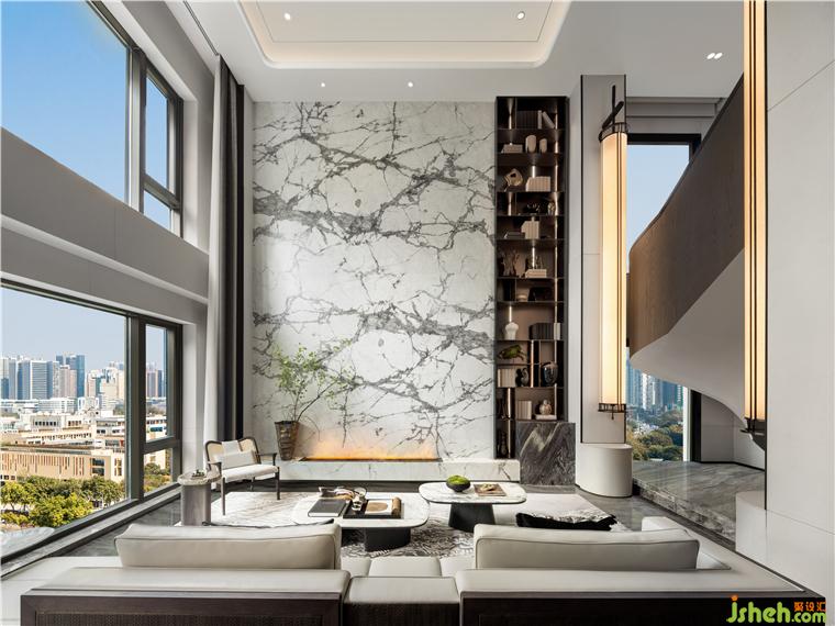 龍湖恒邦·花千樾別墅設(shè)計(jì)以玻璃幕巧妙借景,隨物賦形,盡光而變。大理石墻面被引入折射的角度,間接承擔(dān)建筑的采光需求。