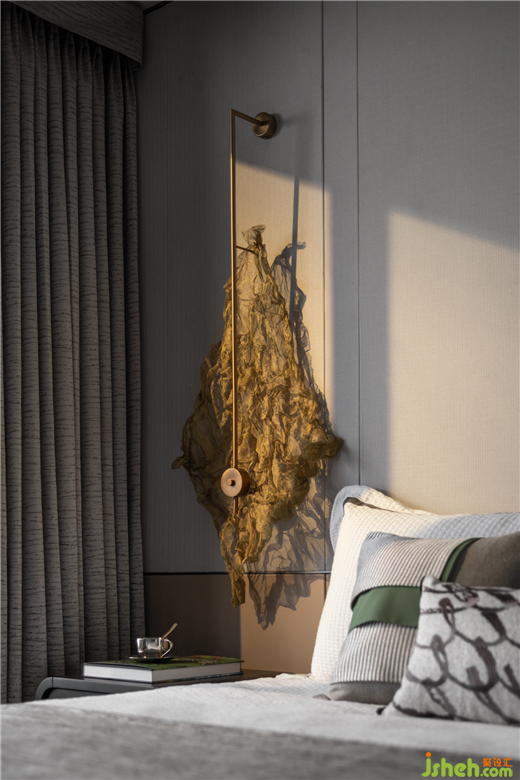 淺灰色木飾面帶來足夠安全的包裹感,深灰半圓的床頭柜輕巧精致,配上金屬臺燈極富質(zhì)感,左側(cè)的干草藝術(shù)裝置,破除了對仗的統(tǒng)一,帶來了更為新鮮的視覺體驗。