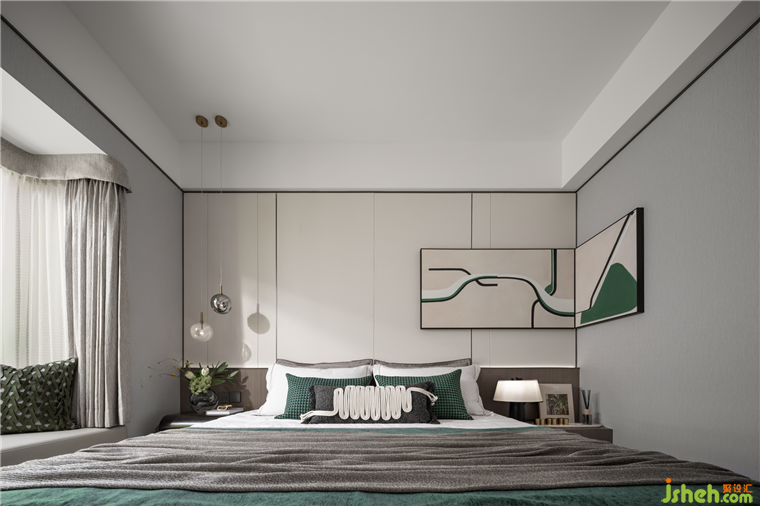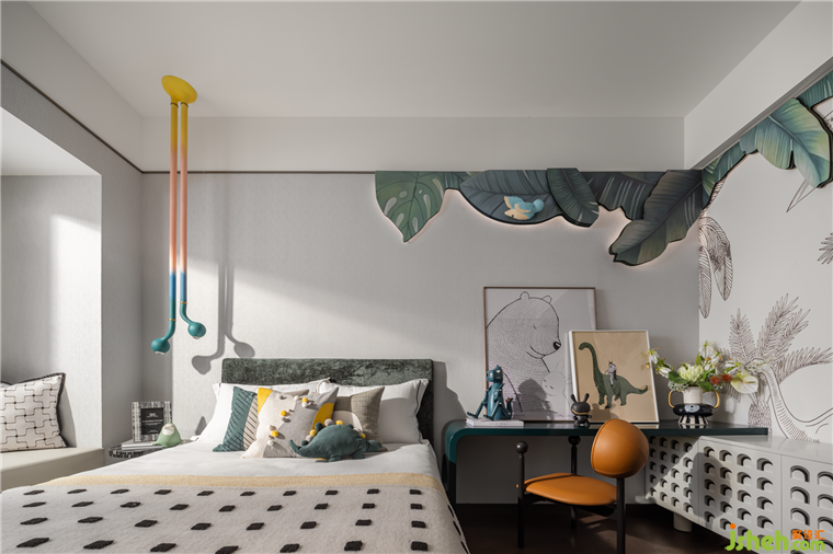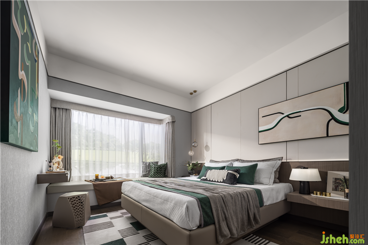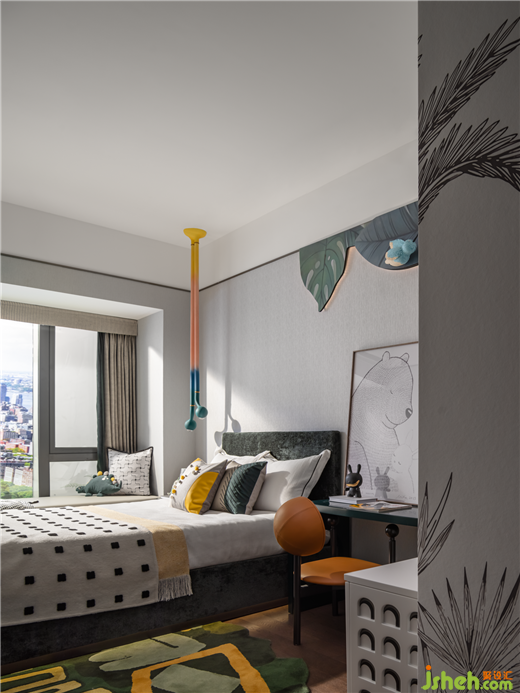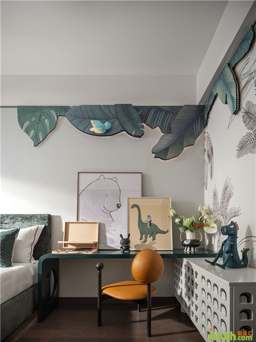 萬科樣板房設(shè)計以官綠、黃白游為空間主色彩,傳統(tǒng)細膩的中國色給予靜謐美好的歲月沉淀感。墻面大塊面的葉片裝飾畫與床品及地毯形成呼應(yīng),仿佛居住在森林一般。
