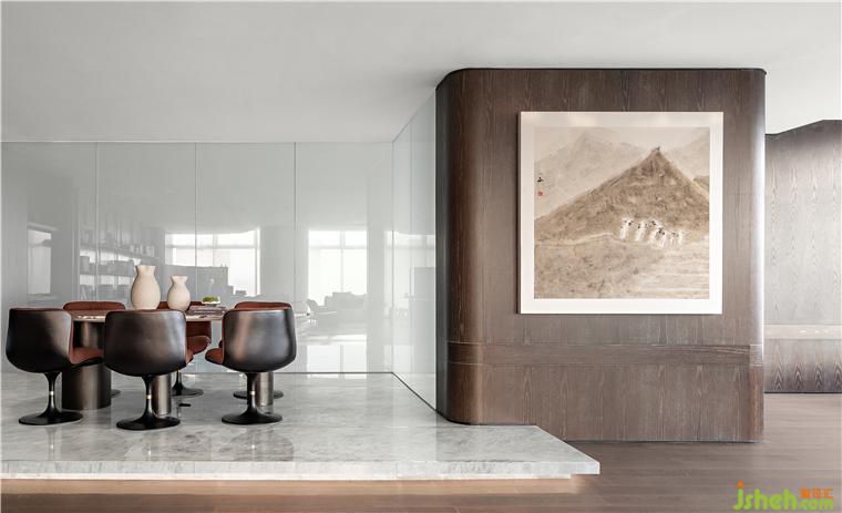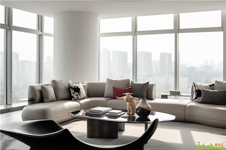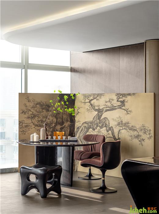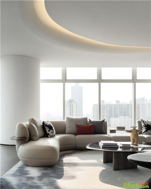 蜿蜒如流水的沙發(fā)與水墨紋理的地毯相得益彰,在這樣的一個(gè)躍層空間中,自然光從落地大窗傾斜進(jìn)來(lái)與沙發(fā)的皮質(zhì)交融,散發(fā)盈盈的光澤,通透而靈活。沙發(fā)來(lái)自設(shè)計(jì)師黃全原創(chuàng)家居品牌「幾間」。