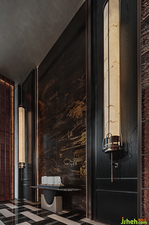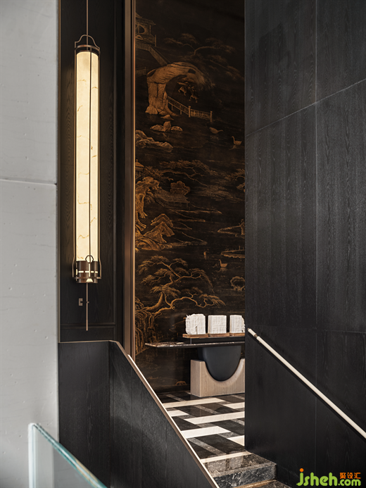 移步首層大堂,引入眼簾的巨幅漆畫(huà)帶給人氣勢(shì)磅礴的視覺(jué)震撼,營(yíng)銷(xiāo)中心設(shè)計(jì)以傳統(tǒng)描金工藝手工繪制的山水樓閣圖,布局疏朗有致,彰顯出濃郁的藝術(shù)氣質(zhì),以及清新雅致的文人氣息。地面拼花材質(zhì)隱喻“步步生花”,與藝術(shù)的漆畫(huà)相互呼應(yīng),賦予了歸家之路的尊享化體驗(yàn)。溫柔潔凈的石材,搭配高貴氣質(zhì)的深色木飾面,光在空間的遞進(jìn)中溢出,形體的繁復(fù)將人們游移的視野填滿(mǎn)瑩然的焦色光,如同玉石的溫潤(rùn)和質(zhì)感,將玻璃的朦朧、拼花地板的復(fù)古和石材拼接而成的墻面的肌理感,逐一映襯、渲染。