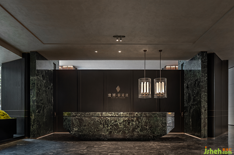 深色木飾面的背景與云紋綠奢石的接待臺(tái),在柔和燈光的映射下,呈現(xiàn)出氤氳的朦朧感,光陰與歲月在此靜靜地沉淀與流淌。