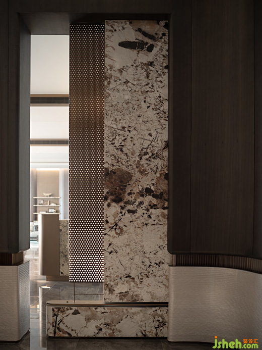 對稱與序列營造儀式感,為訪客打造尊貴的空間體驗。營銷中心設(shè)計借助熱彎巖板工藝,高貴雅致的雪山銀狐巖板被流暢地彎曲成一體化造型,呈現(xiàn)獨特的視覺效果。金屬浮雕再現(xiàn)商路通達、圩市活躍的繁忙景象,鏤空舊船體擺件,寫意呈現(xiàn)行旅交錯、往來如織的城市活。打開感官維度,訪客亦是歷史的回溯者。