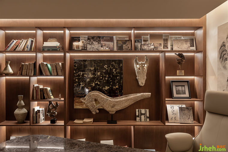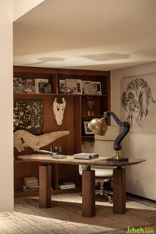 步入靜謐的書房,展示柜上陳列著居者的藝術(shù)藏品,一方書桌承載起生活的氣息,復(fù)古風(fēng)格的金屬臺(tái)燈,映襯著棕色花紋的大理石臺(tái)面,柔和的線條,溫潤(rùn)的色調(diào),終覺(jué)內(nèi)心寧?kù)o。