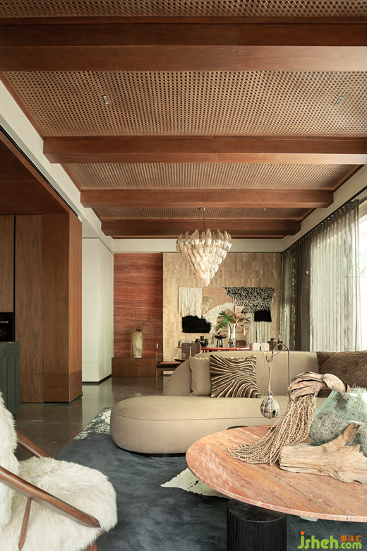 窗外,明媚的暖陽映照進客廳,由心恣意,明朗自由,于寬敞的格局中,找尋自然的詩意,以柔和的家具進行圍合式的布局,兩三好友,歡言得所憩。