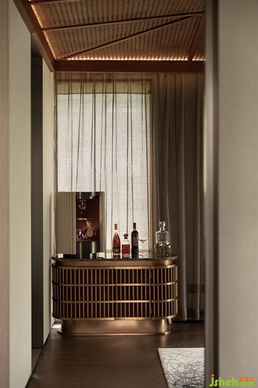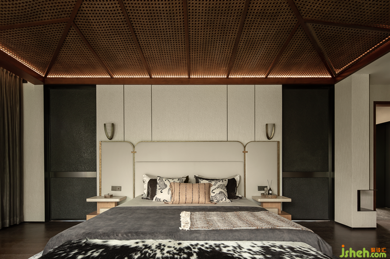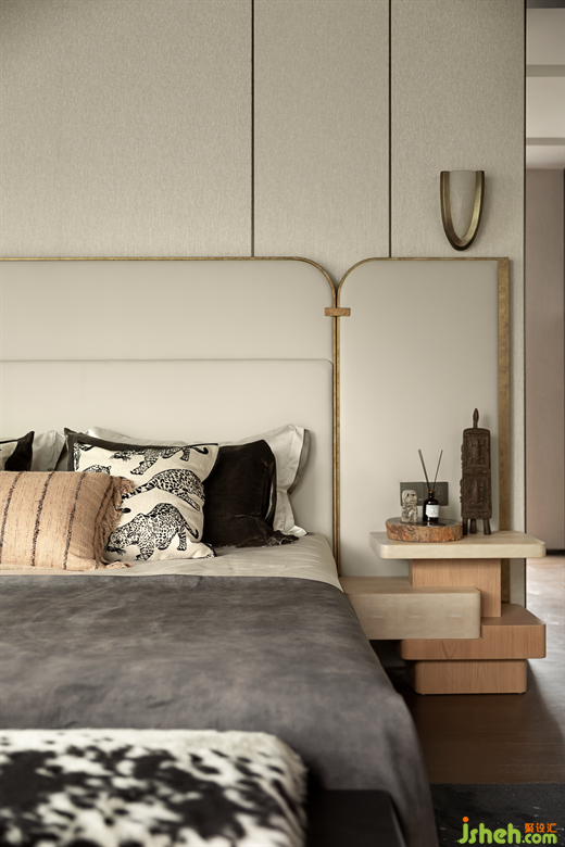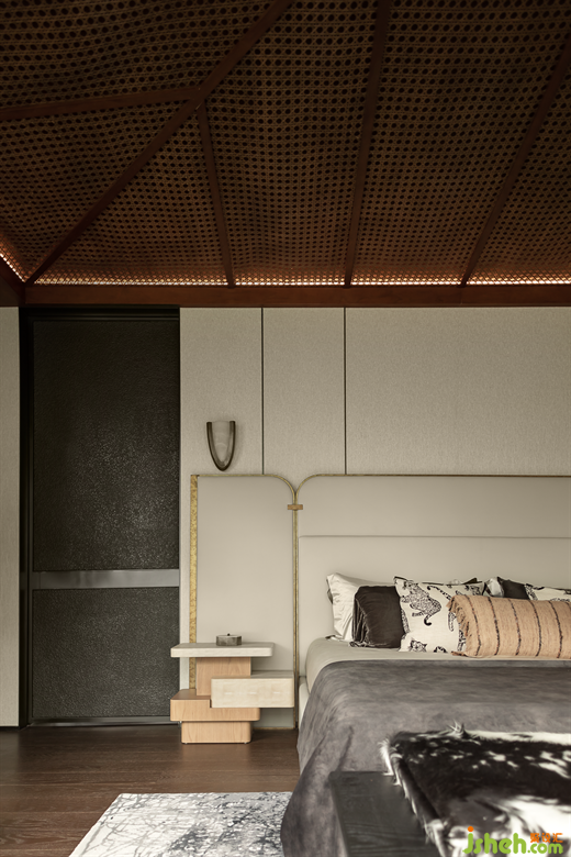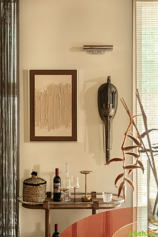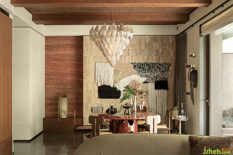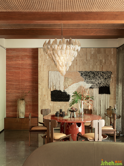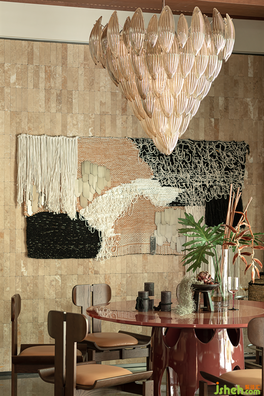 餐廳以明暗交錯的花磚拼貼營造出斑駁的肌理感,充滿野奢意趣的吊燈,樣板房設計搭配中古風格的餐桌椅,呈現(xiàn)出質樸、純粹的曠野美學。
