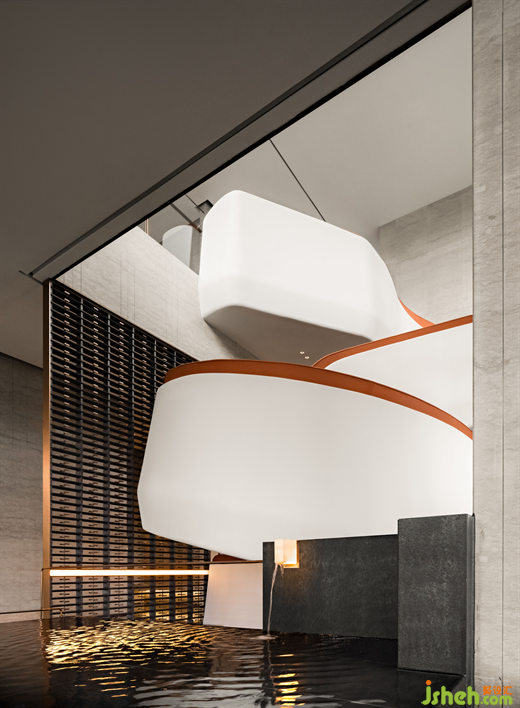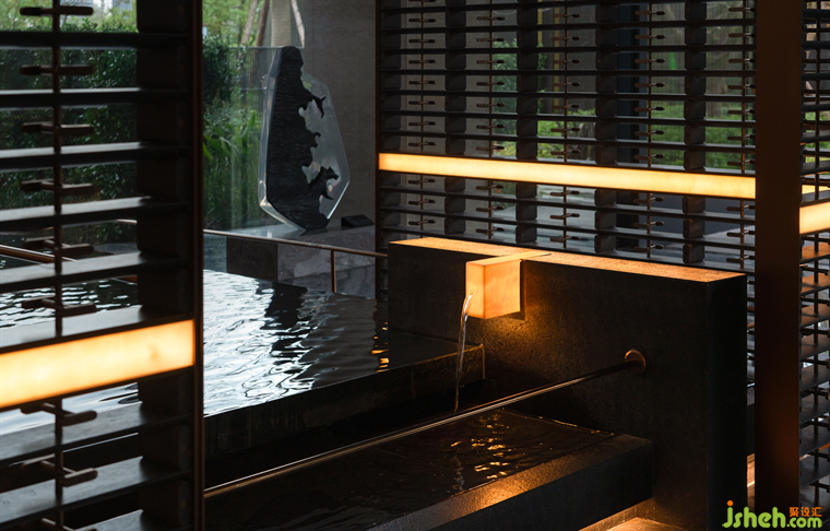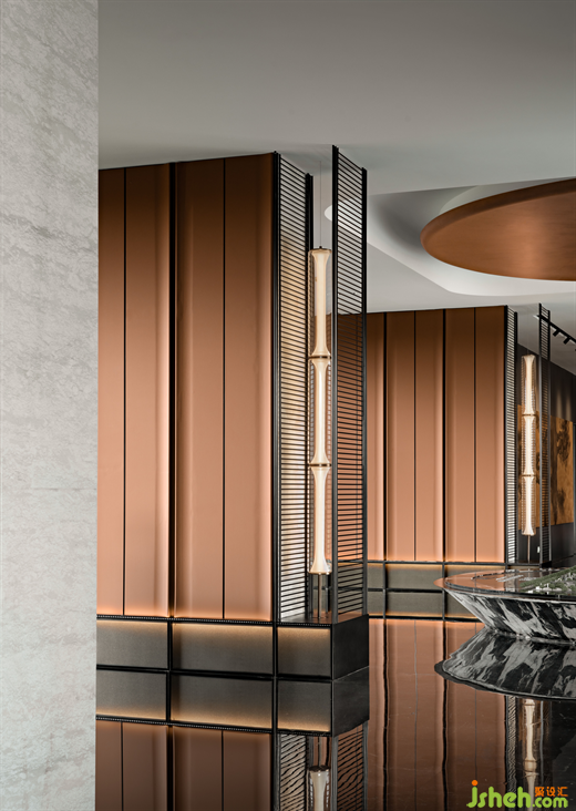 接待臺以不規(guī)則吊燈呼應寄暢園的游園之景,曲面的堆疊如園景中的奇石,又如湖水漣漪的暗紋,柔和的暖光亦似水中月影,營造了空間的獨特氣質,游走于東方詩性之境,開啟序言之門。