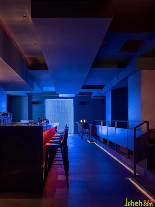 在對梁體和管道進(jìn)行包覆之后,就自然形成了層層疊疊的體塊關(guān)系。凹洞內(nèi),加入彩色的燈光酒吧裝修設(shè)計,形成迷幻的“天窗”效果。