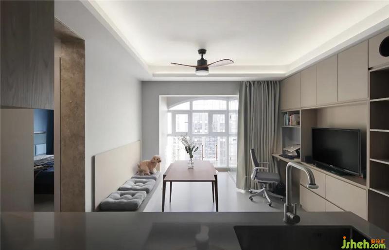 客廳、餐廳、工作區(qū)公寓裝修設(shè)計(jì)、寵物玩樂陽臺(tái)等多功能合并,是生活習(xí)慣的結(jié)果——就餐時(shí)觀影,工作時(shí)陪伴愛寵,其樂融融不乏樂趣。