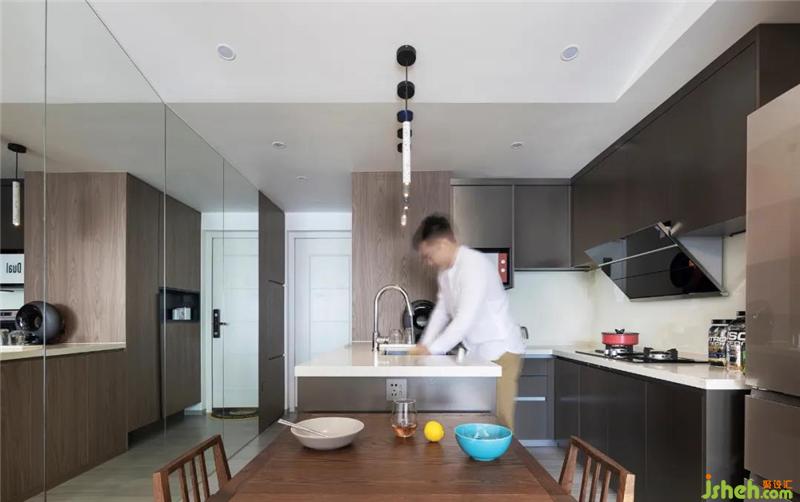 從玄關(guān)延伸至餐廳的通高鏡面,增加了雙倍空間的視覺效果。施展廚藝時的互動,深圳裝修設計也變成了雙倍的快樂。