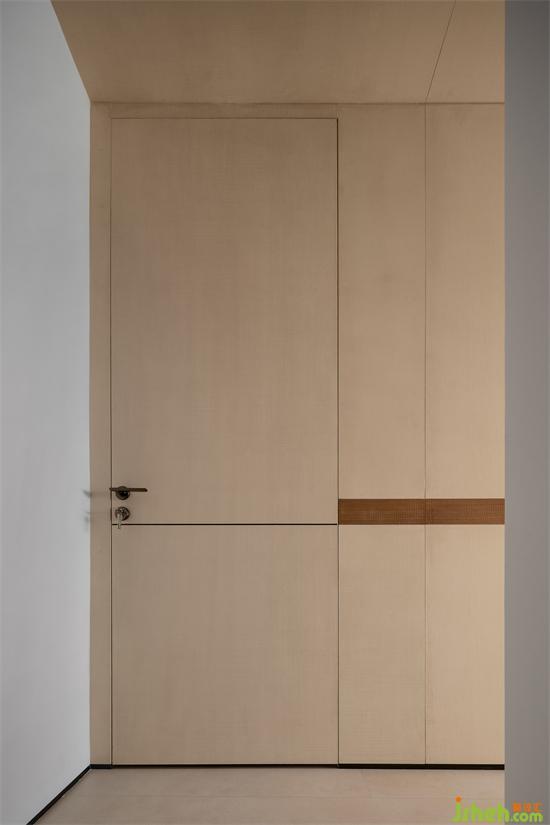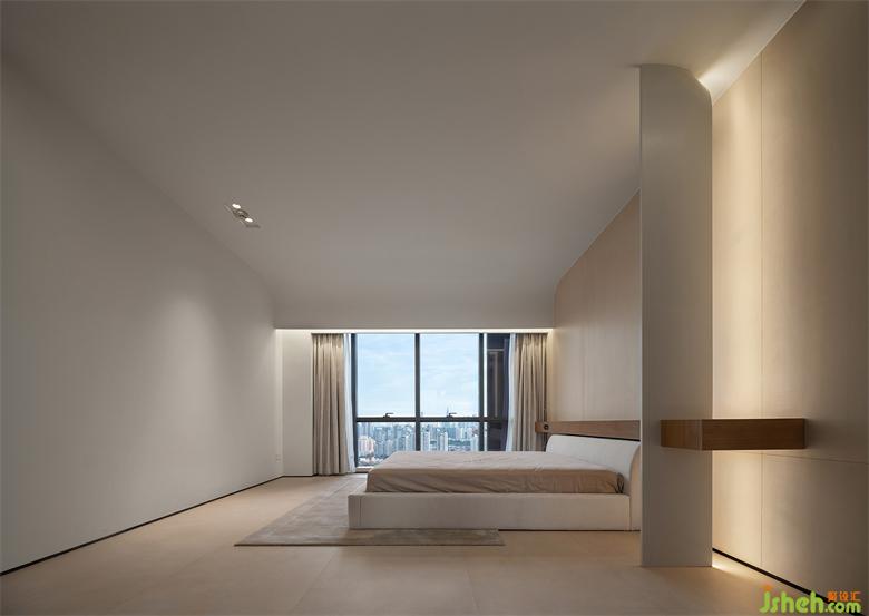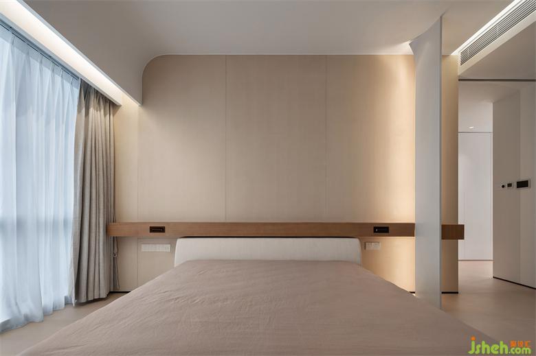 The design method mentioned above has been extended to the master bedroom. The master bedroom combines four functions of study, cloakroom, bedroom and toilet, and is separated by multiple concealed doors and hidden doors. The specially customized bedside device is the highlight of the space, that is, the lamp is also a screen, which is skillfully kneaded.