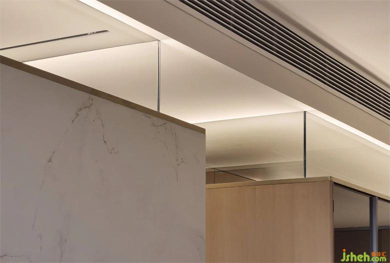 Another advantage of not topping the wall is that equipment such as central air conditioning are placed outside the living and dining room area. In this way, the ceiling does not need to be shaped, and the height of the space can be maximized.
