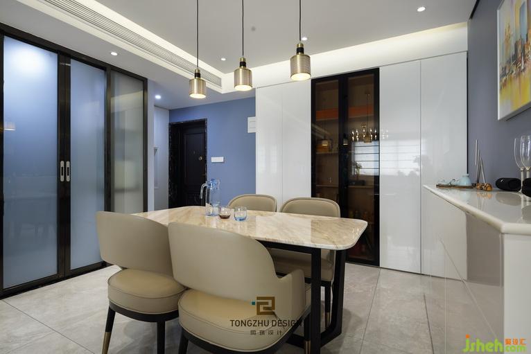 其一,油畫中的一抹流光晚霞點亮雅靜的餐廳,其二,大理石餐桌壁柜的冷與黃色皮椅吊燈的暖相互碰撞,兩者使空間形成一動一靜的對照,家庭的溫暖安逸、煙火氣息、生活樂趣都在其中。