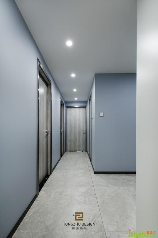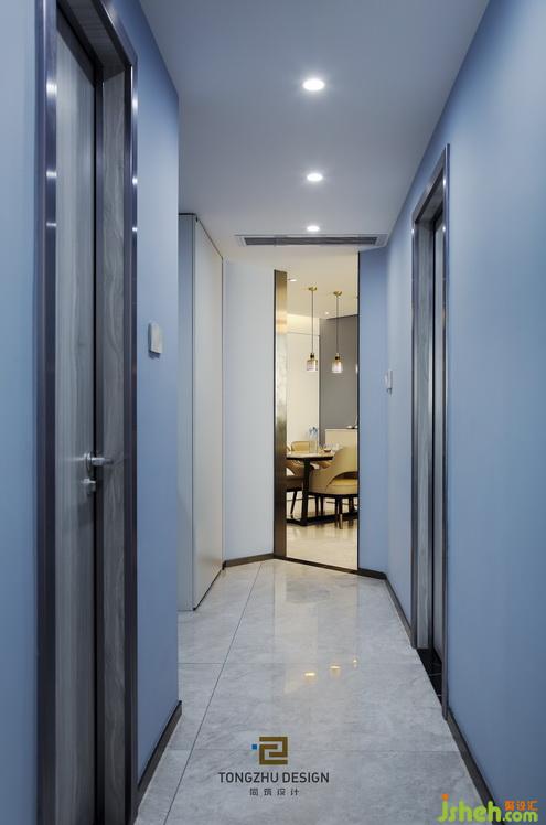 簡潔明朗的走廊,被藍色所包圍,穿梭其中,竟有身處空靈的感覺,又如時光隧道,一路承載與記錄著一家人的點點滴滴。