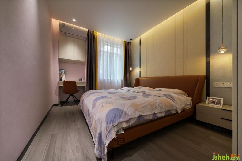 燈光營造下的主臥,簡單而溫馨,透光窗戶,看都市繁華,享城市美景,過自在生活。