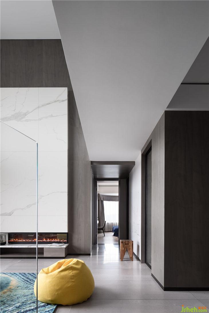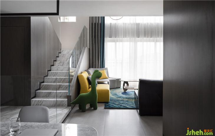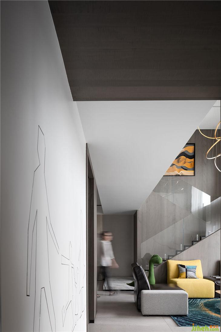 6 metres high pick-air living room, the disigner took a modern refined white-grey tone, this match seems simple, but it presents by extreme modern aesthetics skill, shows the beauty of the house.