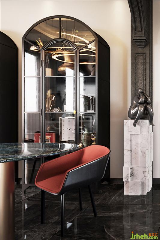 LDK整個空間主要以木質(zhì)、金屬和石材來呈現(xiàn),搭配精致的軟裝家具,豐富整個空間的層次感,營造出濃郁沉穩(wěn)的基調(diào)。 地面選用深色大理石石材,天然紋理,與進(jìn)口紅橡木所組成的線面渾然一體;客廳電視背景墻則采用簡歐風(fēng)格的墻布,兩者之間形成獨特的空間氛圍。 餐椅的楓葉紅作為空間亮點,很好地提升了空間的活潑度,明亮而愉快。